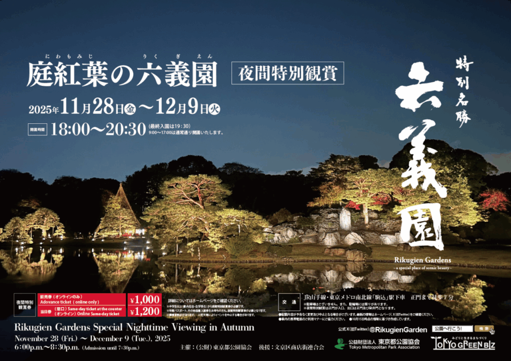Entre 28 de novembro e 9 de dezembro de 2025, o Jardim Rikugien, em Bunkyō-ku (Tóquio), abre ao público numa edição especial: “Nighttime Autumn Foliage Special Viewing”. Das 18h às 20h30 (última entrada às 19h30) o espaço acende suas luzes para revelar as cores do outono sob outra perspectiva.